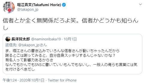 「信者とか全く無関係だろよ笑。信者かどうかも知らんし」といつも通りの感じだ。たしかにホリエモン自身は悪いことはしていない。