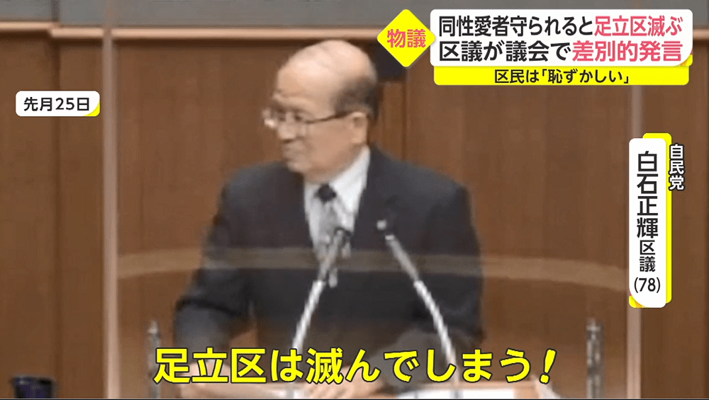 「同性愛が広がれば足立区は滅びる」と白石区議が発言している