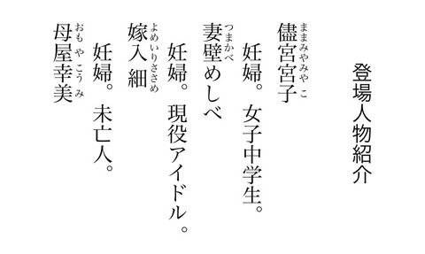 尋常ではない申し出に困惑しつつも、宮子はこの招待を受けることにする。それぞれの事情を抱えた妊婦5人がそこに集った。一体何が始まるのか? そして誰に安産の女神は微笑むのか!?