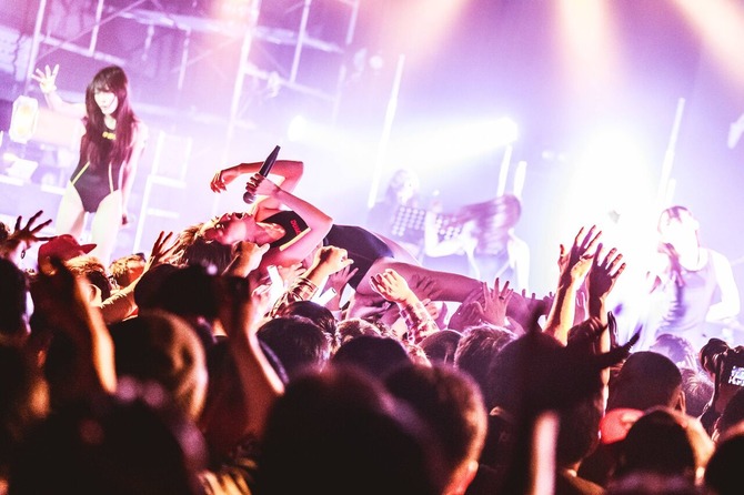 【画像】JKアイドル、スク水で客席ダイブし身体を触られまくる