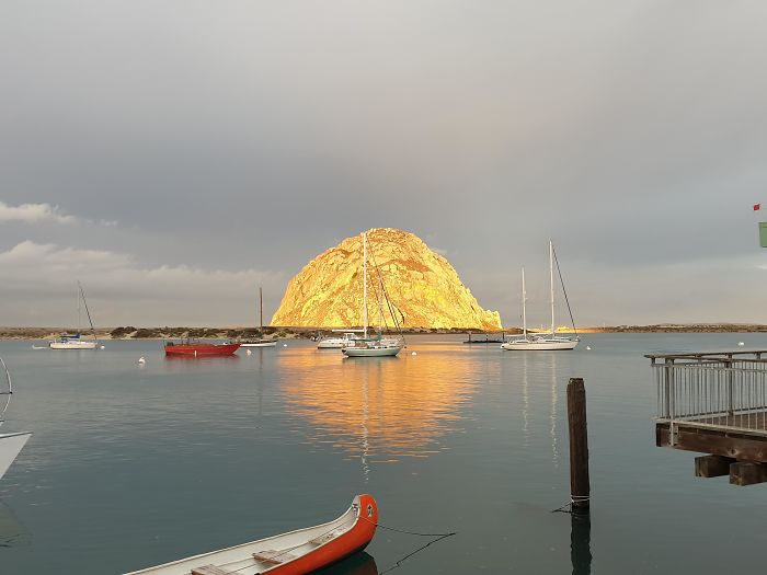 日の出の瞬間、金塊のように見える岩頸(カリフォルニア州のモーロ・ロック)