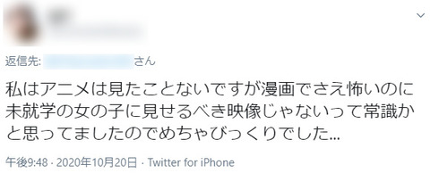 「大人の私でも最初怖くて見れなかったですもん」というリプライが投稿されている。余談ではあるが、劇場版『鬼滅の刃』のレイティングはPG12となっており誰でも見ることは可能だが