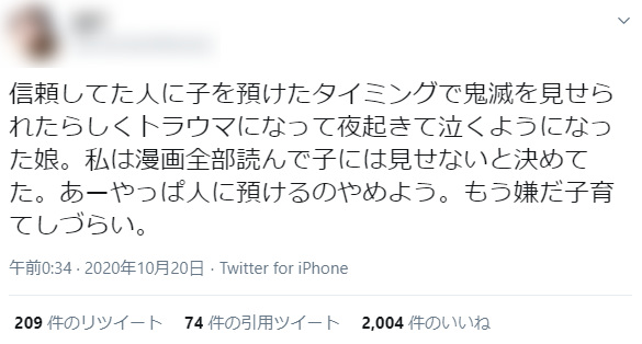 トラウマになって夜起きて泣くようになった娘」としており、グロテスクな表現のある『鬼滅の刃』を見たことによりトラウマとなってしまったという。この女性のお子さんは前後のツイートから推測すると幼稚園と思われ、まだそういう耐性が無い状態、