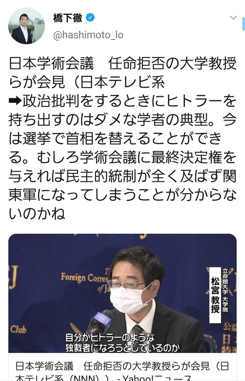 【悲報】橋下徹「政治批判でヒトラーを持ち出すのはバカ、今は選挙で首相を替えることができる」