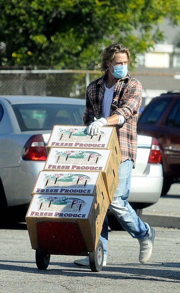 マスクやカジュアルな服装のため彼だと気づいている人はおそらくほとんどいなかった。誰よりも多く箱を運び、荷下ろしが終わった後は列に並んでいる人々にそれらを配っていた