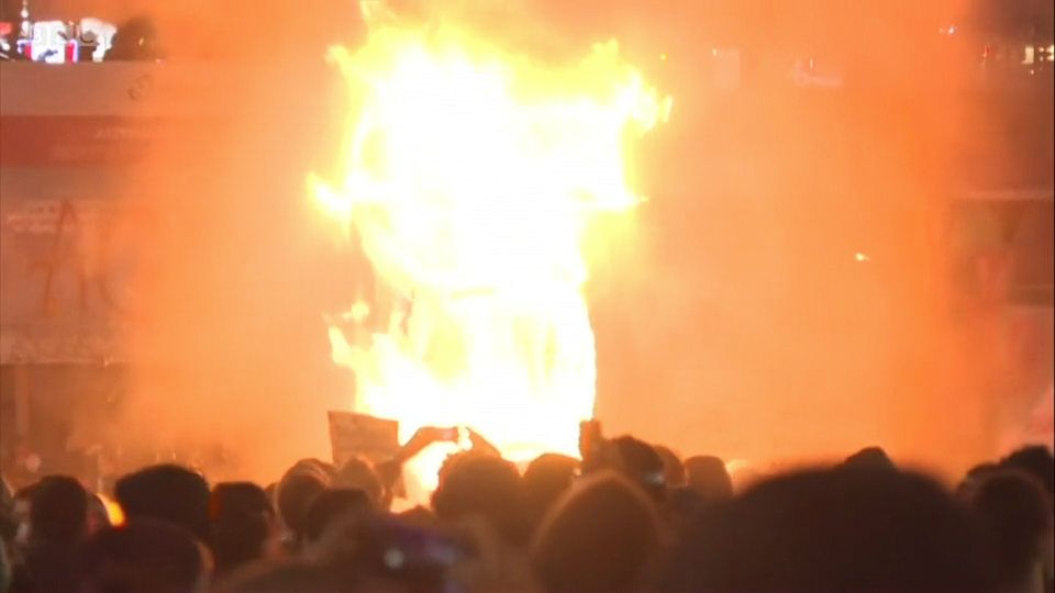 デモ隊の大半は平和的に行進していたが、一部が警官に石や花火を投げ付けるなどして警官隊と衝突した。複数の車や新聞販売店に火がつけられた。