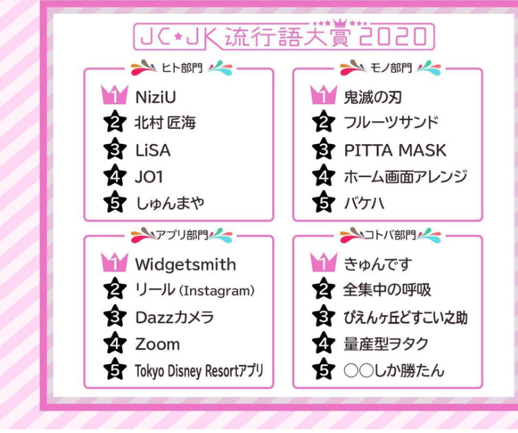 【※画像あり】「JC・JK流行語大賞2020」発表!!「NiziU」「JO1」「鬼滅」にJCJKが熱狂wxwxwxxw