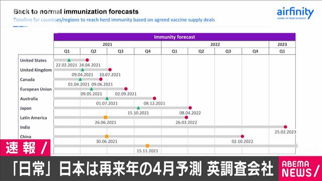 世界各国で新型コロナの感染拡大が続く中、イギリスの調査会社は社会が日常に戻る時期を国ごとに予測、日本は再来年の4月と先進国で最も遅い結果となった。イギリスの医療調査会社「エ\(^o^)/ニティー」は、各国が確保しているワクチンの量に基づき国民の多くが接種し免疫を持つことで感染拡大を抑える「集団免疫」を獲得し、日常に戻る時期を予測した。この予測で日本は再来年の4月とされた。