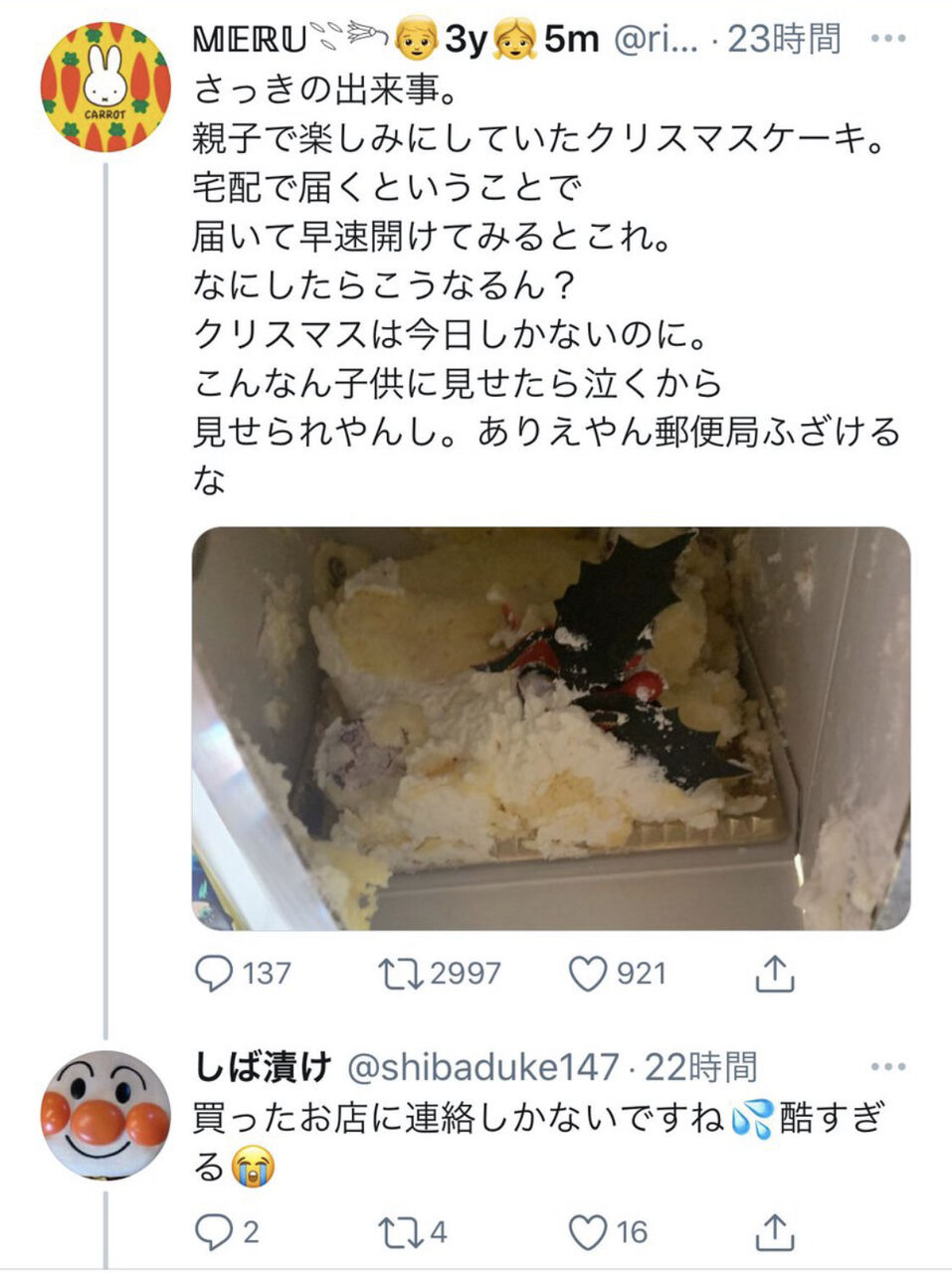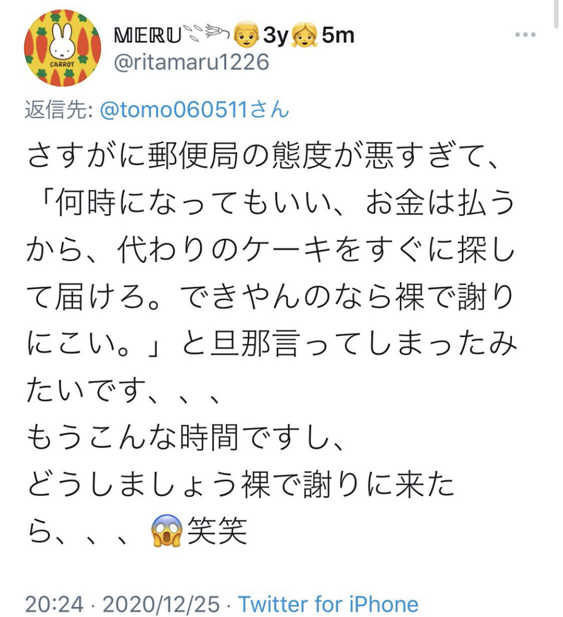 ホーム > ニュースetc > 【炎上】 ケーキを送られた女さん、ブチ切れて郵便局員に謝罪させてしまうwwwww 2020/12/27 1: 名無し募集中。。。 2020/12/26(土) 22:12:54.36 0 https://mobile.twitter.com/ritamaru1226/status/1342406680420741120 こちらもおすすめ //rcm.shinobi.jp/js/imp.js //rcm.shinobi.jp/r/a05b27d5d053209f3455b9e3474919ca http://rcm.shinobi.jp/js/imp.js http://rcm.shinobi.jp/r/28ae6821bf6eec419a5df803f44ea1c6 続きを読む Source: お料理速報 - ニュースetc