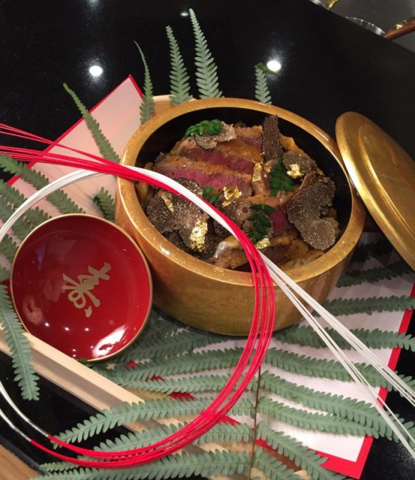 熟練の職人がカウンター前の鉄板でレアに仕上げますので、その見事な手さばきもお楽しみいただけます。また、高級食材トリュフや金箔もプラスし、より豪華な1皿となっております。