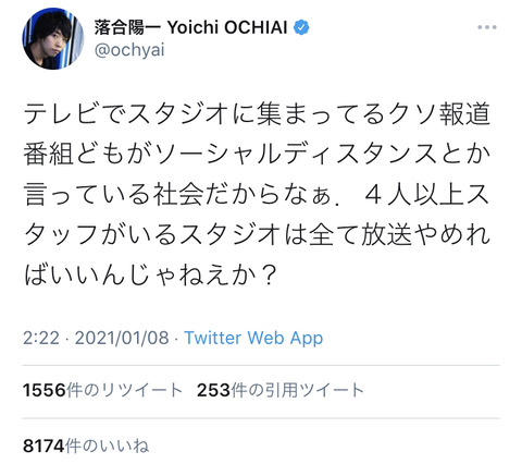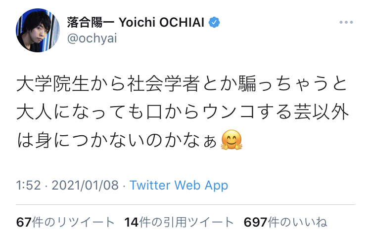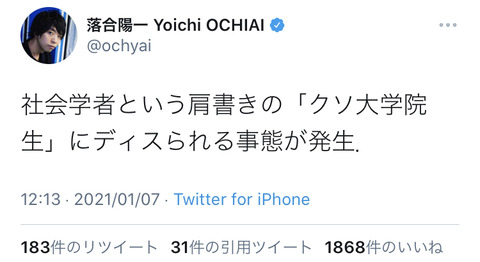 ホーム > ニュースetc > 【悲報】落合陽一、古市憲寿にブチ切れwwwwwwwwww「社会学者とか名乗ってるウンコが俺にクソ吐きやがった」 2021/01/08 1:以下、?ちゃんねるからVIPがお送りします:2021/01/08(金) 13:36:47.466 ID:Hmn537Oqd.net 続きを読む Source: ラビット速報 - ニュースetc