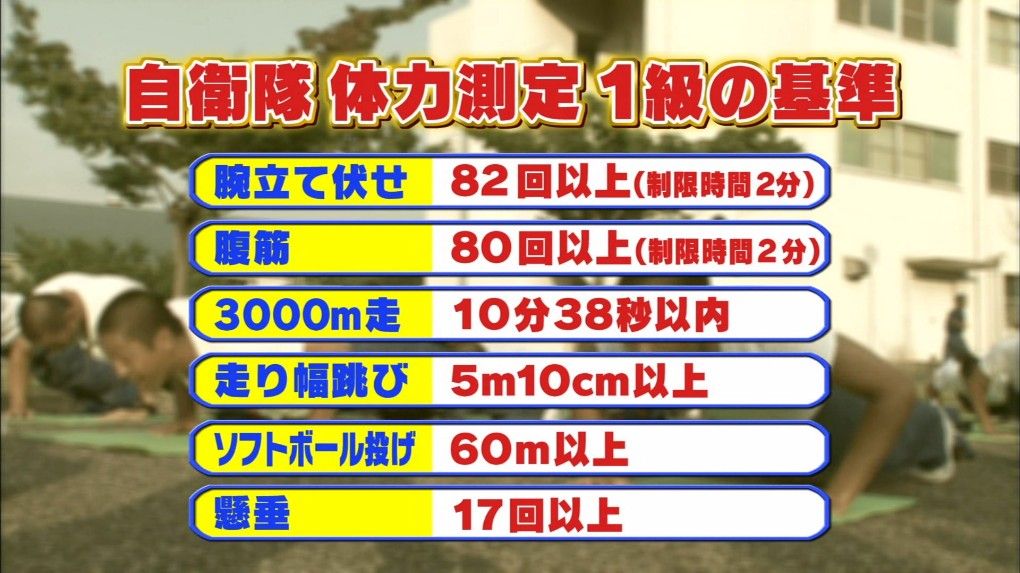 ホーム > ニュースetc > 【画像】自衛隊体力測定の1級合格基準wwwwwwwww 2021/01/10 1: 風吹けば名無し 2020/12/28(月) 20:56:58.24 ID:/0opJnQ60.net 強すぎぃ! 続きを読む Source: 妹はVIPPER - ニュースetc
