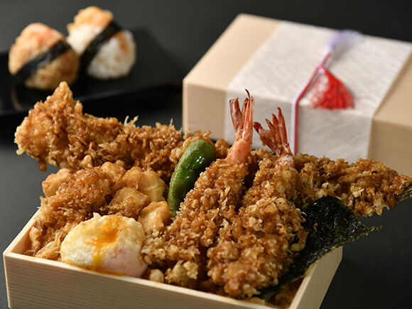 金子半之助を代表する逸品。豊洲市場で仕入れる新鮮な穴子1本、海老2本、烏賊のかき揚げに半熟卵の天ぷらもトッピング。揚げ立ての天ぷらを豪快に盛り付けた自慢の天丼は、秘伝の丼たれがご飯にも浸みて最後の飯ひと粒まで口福を感じていただけるおいしさです。