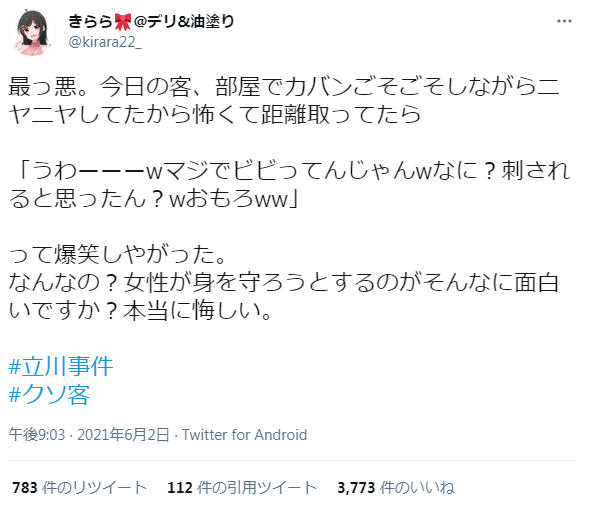 なんなの?女性が身を守ろうとするのがそんなに面白いですか?本当に悔しい。#立川事件 #クソ客— きらら🎀@デリ&油塗り (@kirara22_) June 2, 2021