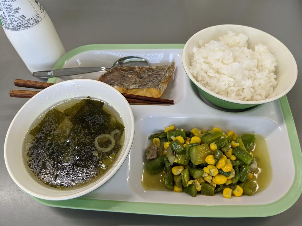 大根と海藻のスープ、白米、ガラス瓶に入った牛乳200ml