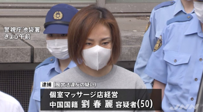 風営法違反の疑いで逮捕されたのは、個室マッサージ店を経営する中国国籍の劉春麗容疑者(50)です。劉容疑者は先月上旬ごろ、豊島区池袋のマンションの一室で、営業が禁止されている地域であるのに従業員らに男性客への性的なサービスをさせた疑いがもたれています。