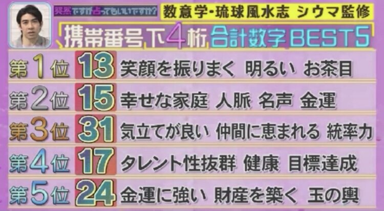ホーム > ニュースetc > 【画像】日本のテレビ番組、令和とは思えないオカルト番組を放送してしまう… 2021/07/12 1: 風吹けば名無し 2021/07/09(金) 20:53:24.12 ID:DIZcDTXo0.net フジテレビ『突然ですが占ってもいいですか?』の「2021年下半期 携帯番号下4桁合計“吉数字”ランキング」より 続きを読む Source: 妹はVIPPER - ニュースetc