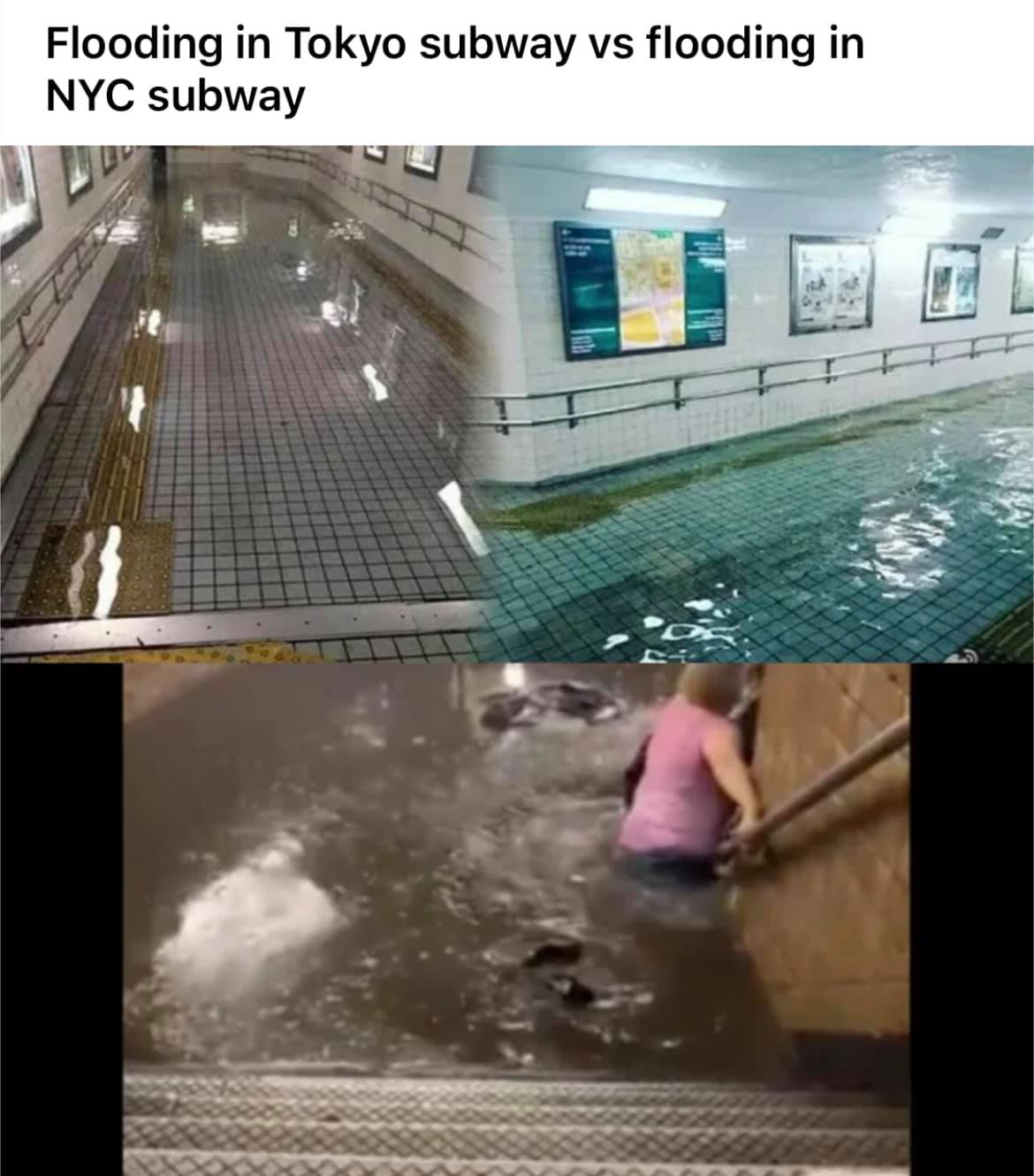 ホーム > ニュースetc > 外国人「洪水時の東京が綺麗すぎる…ニューヨークなんてこれだぜ」 2021/07/13 スレッド「洪水時の東京の地下鉄vs洪水時のニューヨークの地下鉄」より。引用:Facebook (海外の反応) 1万国アノニマスさん 洪水時の東京の地下鉄vs洪水時のニューヨークの地下鉄東京の洪水時の水は綺麗すぎる…まるでプールみたいだ 2万国アノニマスさん これだから俺は日本は最高だと言ってるんだ(笑) 3万国アノニマスさん 地下のスイミングプールだ! 続きを読む Source: 海外の万国反応記 - ニュースetc