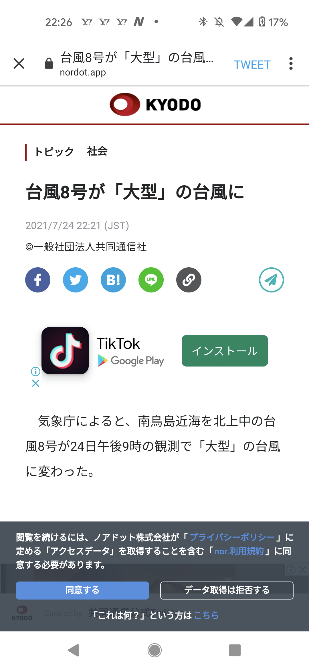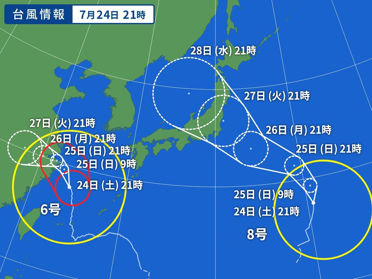 気象庁によると、南鳥島近海を北上中の台風8号が24日午後9時の観測で「大型」の台風に変わった。
