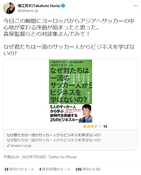 堀江貴文「今日この瞬間にヨーロッパからアジアへサッカーの中心地が変わる序曲が始まった」