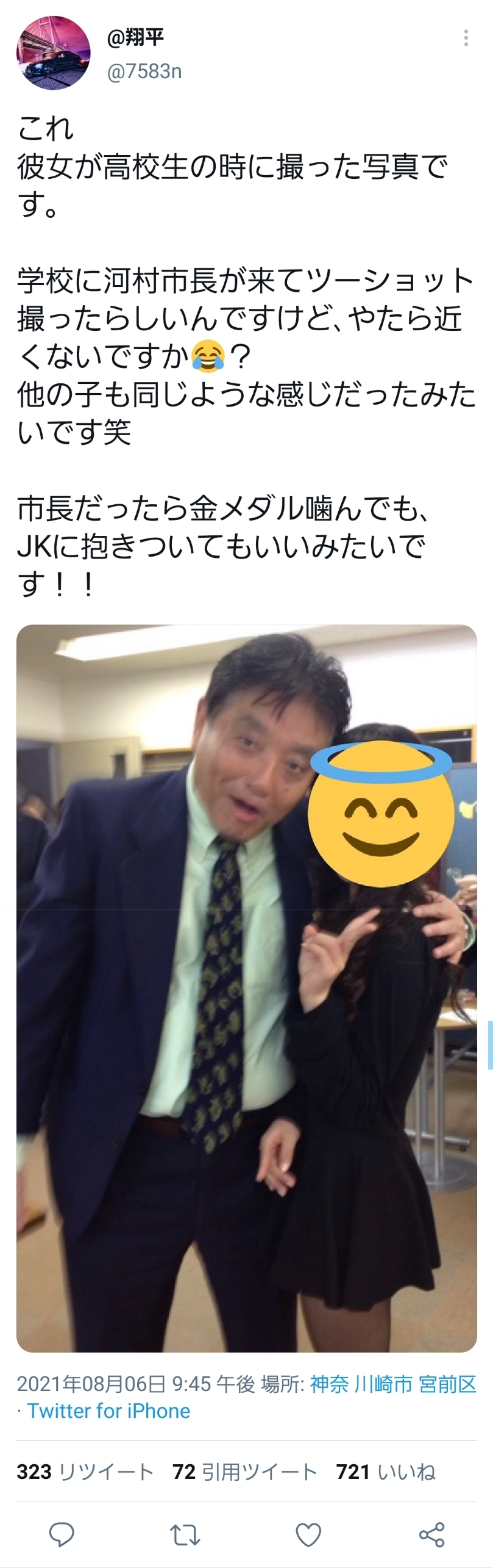 彼女が高校生の時に撮った写真です。学校に河村市長が来てツーショット撮ったらしいんですけど、やたら近くないですか?
