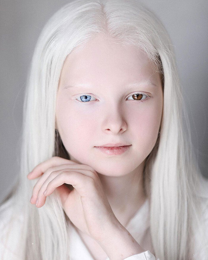 これはアルビノとオッドアイの2つの珍しい遺伝的特徴を持つアミナ・イペンディエヴァさん