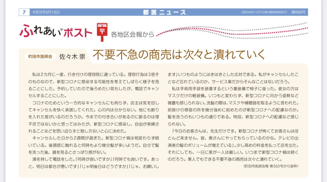 東京都医師会の情報誌「素人でもできる不要不急の商売は次々と潰れていく」コロナ禍で客足遠のく理容院を中傷するコラム掲載東京都医師会が発行する情報誌「都医ニュース」令和3年8月号のコラムで、新型コロナウイルス蔓延により客足が遠のく理容院について「新型コロナに向かう姿勢など微塵も感じられない」「素人でもできる不要不急の商売は次々と潰れていく」と理容師を中傷するような内容が掲載されていたことがわかった。