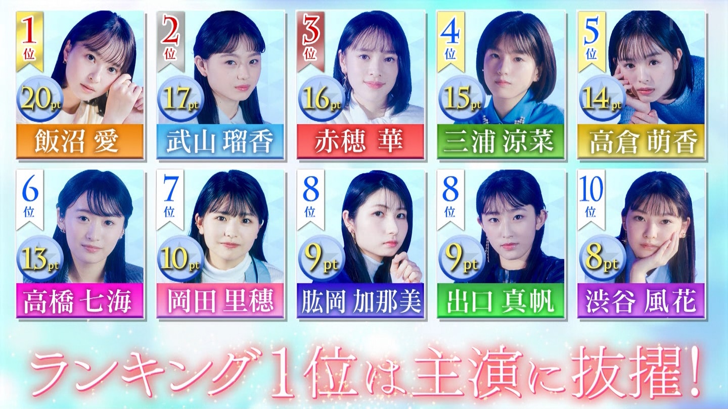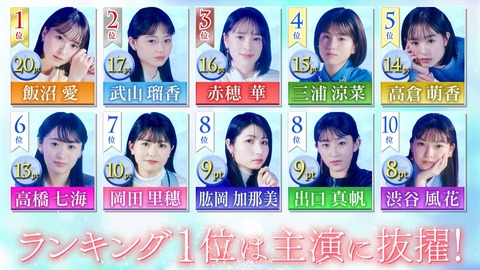 本プロジェクトの総合プロデューサーである秋元康氏は「成長に驚かされた」と賛辞を送った。■演技バトル最終ランキング(合計pt)