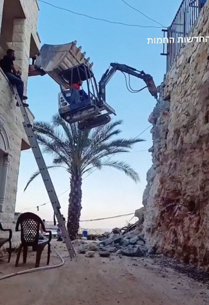 クレーンで吊り下げられてる小さな車両で男がドリルのようなものを操作してるんだよ