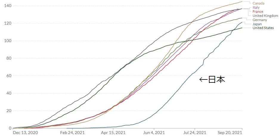 日本で2回ワクチン接種を終えた人の割合がアメリカを超えた