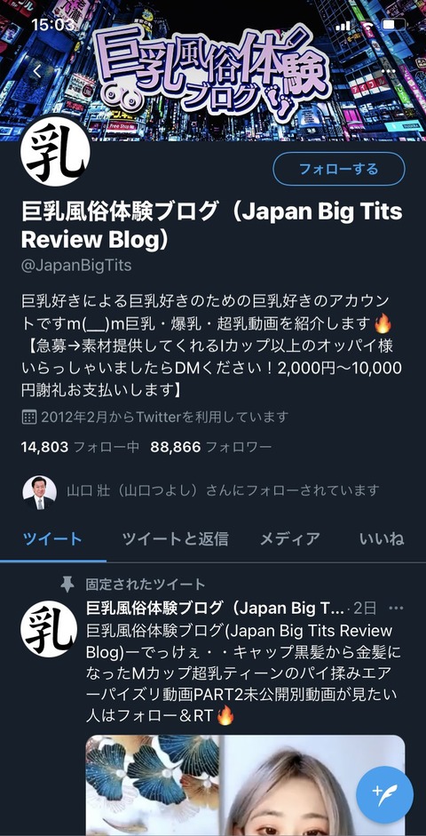 【悲報】山口環境大臣、巨乳風俗と巨乳絵師と巨乳生主のアカウントをフォローしていたwwwww