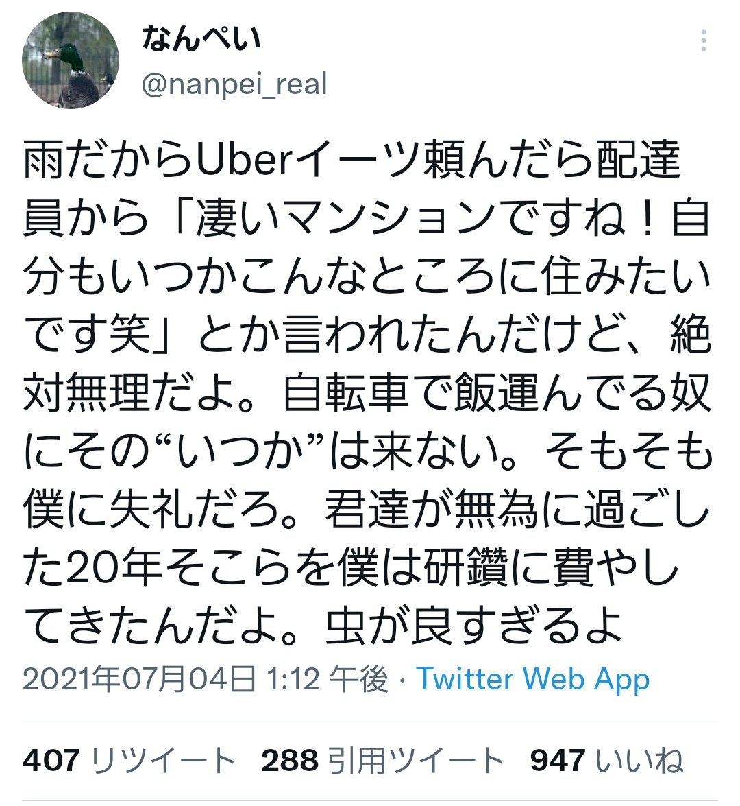 【悲報】ウーバー宅配員「良いタワマンですね。いつか住みたいです!」ツイッター民「…」