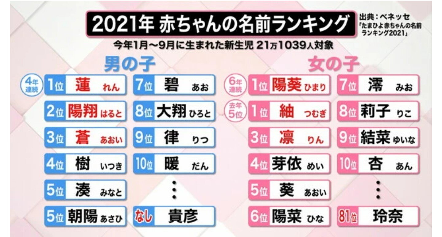 ホーム > ニュースetc > 【令和最新版】赤ちゃんの名前ランキングが発表。キラキラネーム消える… 2021/11/05 1: 風吹けば名無し 2021/11/04(木) 20:07:08.49 ID:WC7JO4g00.net トップは変わらず 続きを読む Source: 妹はVIPPER - ニュースetc