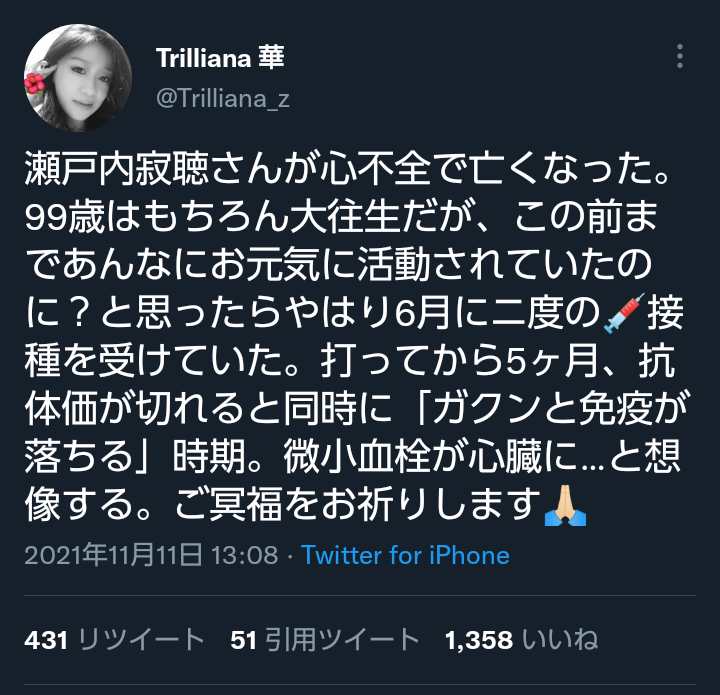 瀬戸内寂聴さんが心不全で亡くなった。99歳はもちろん大往生だが、この前まであんなにお元気に活動されていたのに?と思ったらやはり6月にニ度の💉接種を受けていた。打ってから5ヶ月、抗体価が切れると同時に「ガクンと免疫が落ちる」時期。微小血栓が心臓に…と想像する。ご冥福をお祈りします🙏🏻