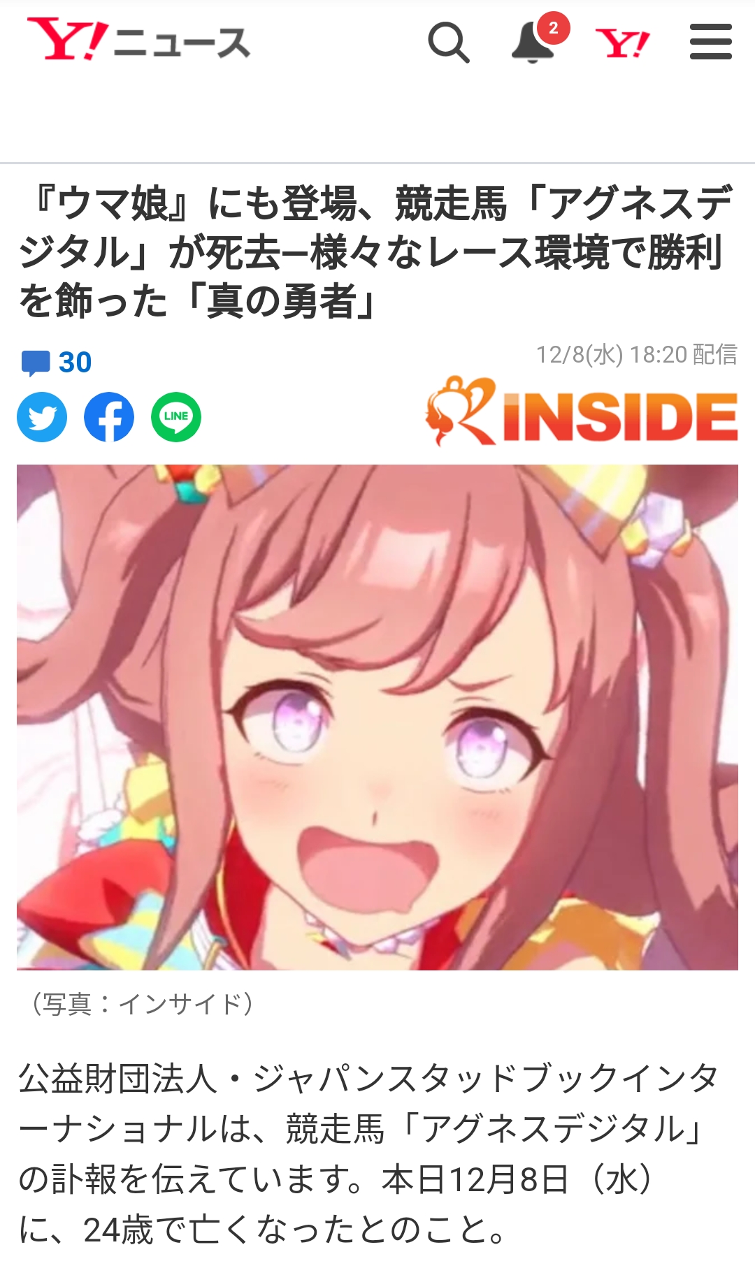 【悲報】Yahooニュース、競走馬「アグネスデジタル」の訃報に「ウマ娘」の画像を使ってしまうwwwwwwwwwww