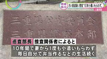 三重県菰野町の神社のさい銭箱から現金およそ200円を盗んだなどとして三重県警察本部は、40代の巡査部長を書類送検するとともに、停職の懲戒処分としました。捜査関係者によると、巡査部長はこの10年間で1度もお小遣いをもらっていなかったということで、調べに対して「タバコやコーヒーを買う金がほしかった」と供述しているということです。