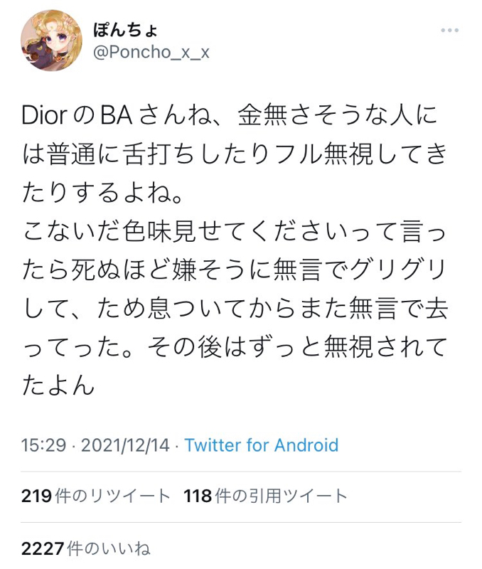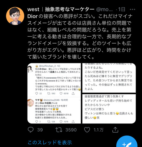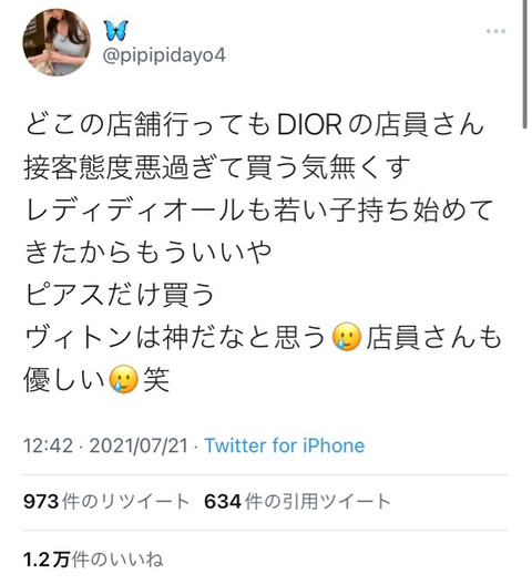 【画像】高級化粧ブランド「Dior」の接客が炎上中。Twitter「学生服で行ったら舐められた」