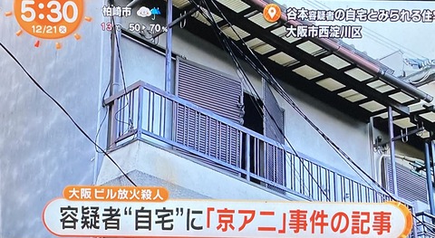 ホーム > ニュースetc > 【悲報】大阪ビル火災容疑者の自宅から「京アニ」事件の記事が見つかった 2021/12/21 1:風吹けば名無し:2021/12/21(火) 05:46:33.90 ID:xsyGcORep.net 2:風吹けば名無し:2021/12/21(火) 05:46:59.65 ID:o+06G+Z80.net 青葉チルドレンやったか 3:風吹けば名無し:2021/12/21(火) 05:47:52.41 ID:v48UJTDG0.net わお 続きを読む Source: ラビット速報 - ニュースetc