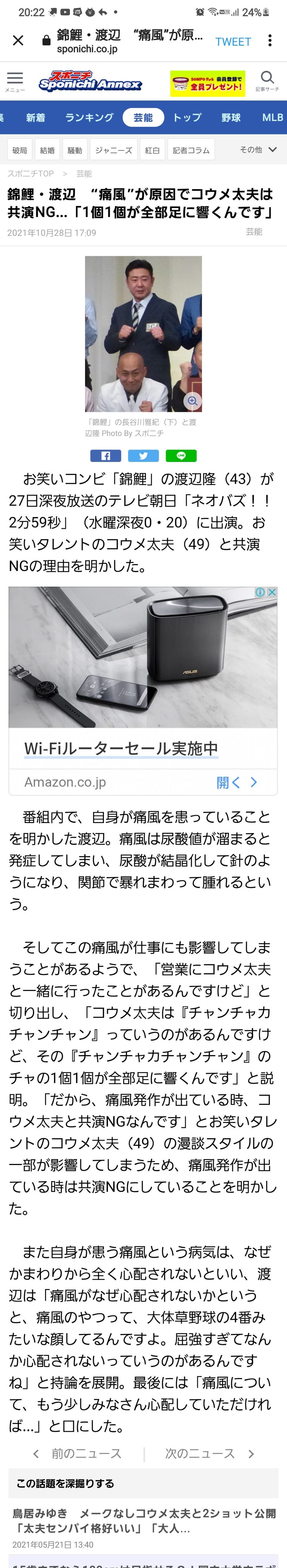 そしてこの痛風が仕事にも影響してしまうことがあるようで、「営業にコウメ太夫と一緒に行ったことがあるんですけど」と切り出し、「コウメ太夫は『チャンチャカチャンチャン』っていうのがあるんですけど、その『チャンチャカチャンチャン』のチャの1個1個が全部足に響くんです」と説明。「だから、痛風発作が出ている時、コウメ太夫と共演NGなんです」とお笑いタレントのコウメ太夫(49)の漫談スタイルの一部が影響してしまうため、痛風発作が出ている時は共演NGにしていることを明かした。