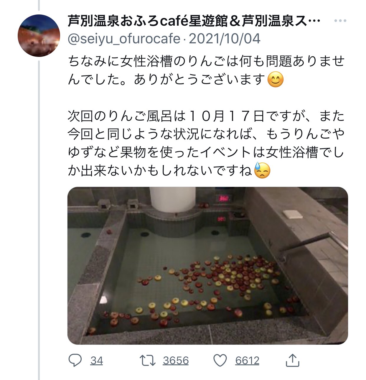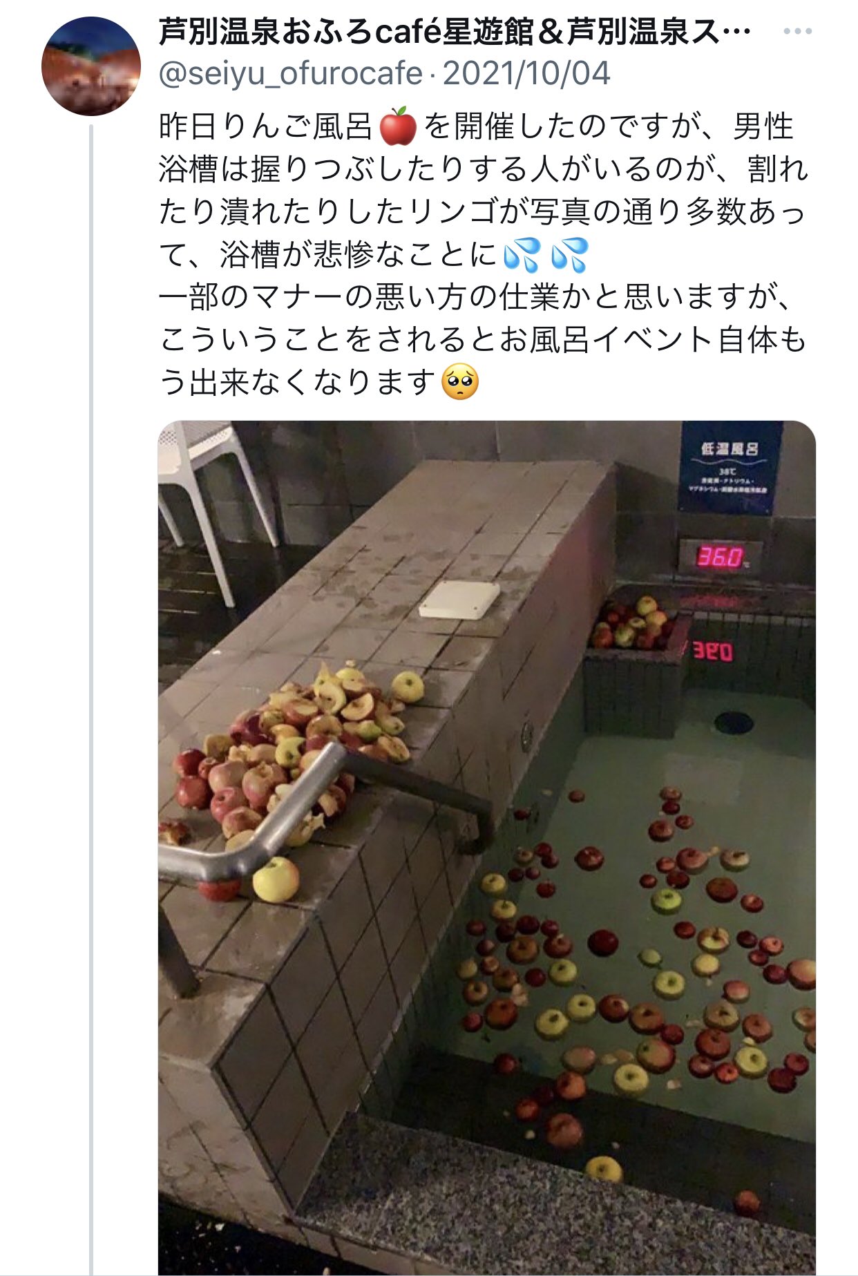 ホーム > ニュースetc > 【悲報】銭湯さん「男湯に柚子を浮かべると握り潰される。果実湯イベントは女湯でしかやりません!!(怒)」 2021/12/29 1: 以下、?ちゃんねるからVIPがお送りします 2021/12/27(月) 19:25:07.544 ID:b23JS4pQd.net 男湯に柚子投入→破壊 ハロウィーンでカボチャ投入→破壊 林檎投入→破壊 果実湯イベントは女性だけにします 続きを読む Source: 妹はVIPPER - ニュースetc