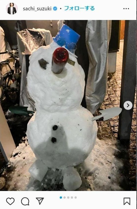 デイリースポーツモデルの鈴木サチが7日、インスタグラムを更新。首都圏に前夜に降った雪で、自身の子供たちがつくった雪だるまがめちゃくちゃに壊されたことを、怒りを込めて告白した。