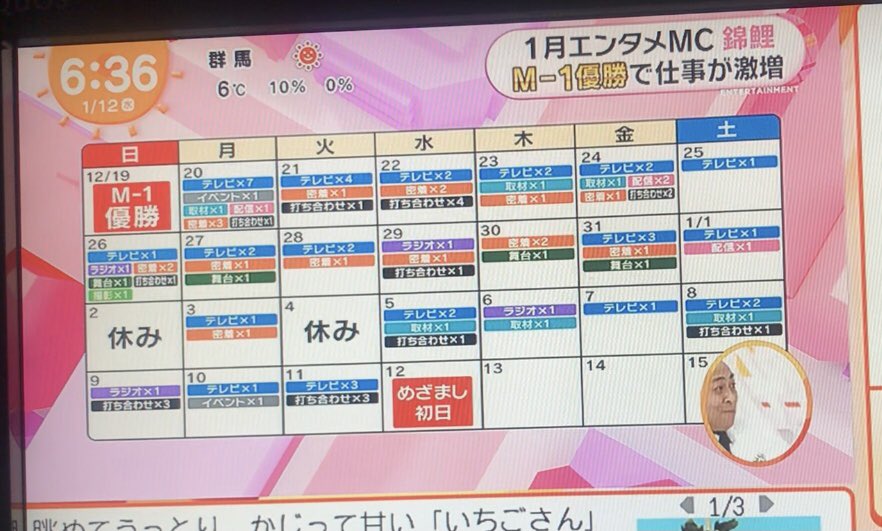 ホーム > ニュースetc > 【画像】錦鯉のM-1優勝後のスケジュールが過密すぎると話題に 2022/01/14 1: 風吹けば名無し 2022/01/12(水) 14:07:24.67 ID:ZdwmPbnmd.net 過労死不可避 続きを読む Source: 妹はVIPPER - ニュースetc