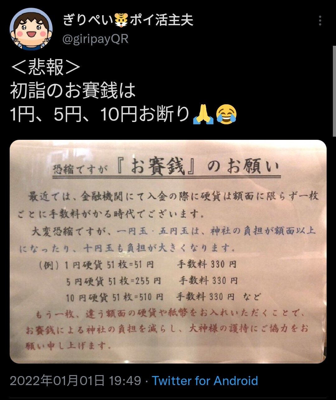 ホーム > ニュースetc > 【悲報】神社「お賽銭は50円以上がマナー。1・5・10円玉は入金手数料の負担が大きいから神様も怒るぞ」 2022/01/19 1: 風吹けば名無し 2022/01/02(日) 18:48:49.96 ID:E3F19hnDd.net https://platform.twitter.com/widgets.js //platform.twitter.com/widgets.js 続きを読む Source: 妹はVIPPER - ニュースetc