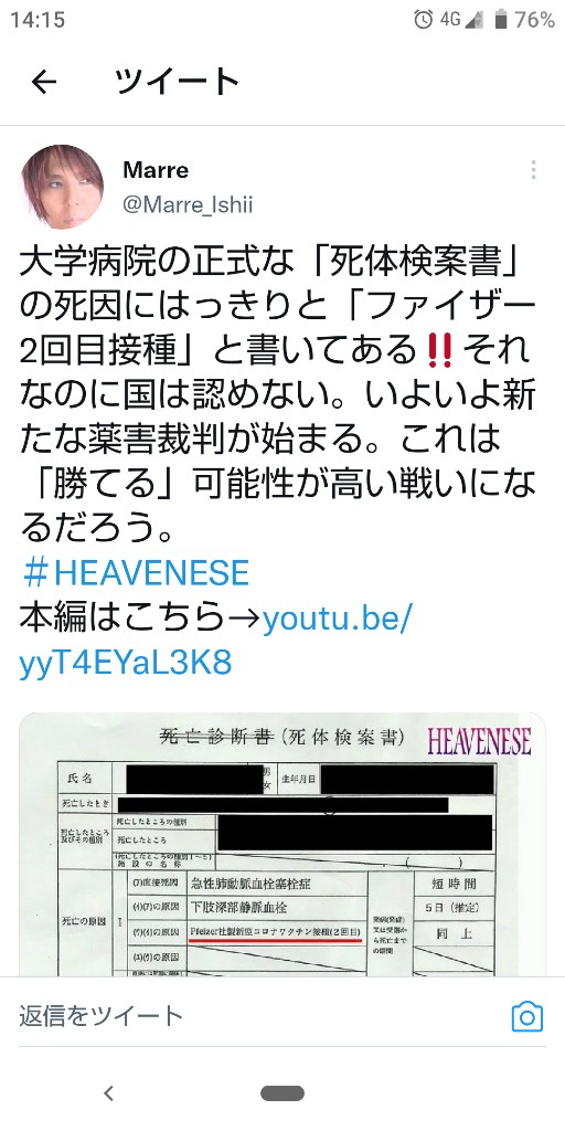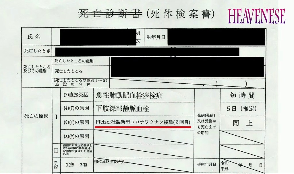 大学病院の正式な「死体検案書」の死因にはっきりと「ファイザー2回目接種」と書いてある‼️それなのに国は認めない。いよいよ新たな薬害裁判が始まる。これは「勝てる」可能性が高い戦いになるだろう。#HEAVENESE
