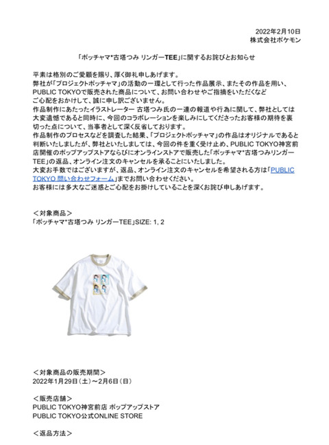 はなかった」とJ-CASTニュースの取材に答えていた。商品の販売を期間内続けていたが、2月10日正午になって、ポケモン社のサイトで「『ポッチャマ*古塔つみ リンガーTEE』に