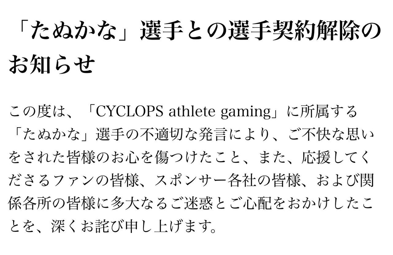 「たぬかな」選手との選手契約解除のお知らせこの度は、「CYCLOPS athlete gaming」に所属する「たぬかな」選手の不適切な発言により、ご不快な思いをされた皆様のお心を傷つけたこと、また、応援してくださるファンの皆様、スポンサー各社の皆様、および関係各所の皆様に多大なるご迷惑とご心配をおかけしたことを、深くお詫び申し上げます。