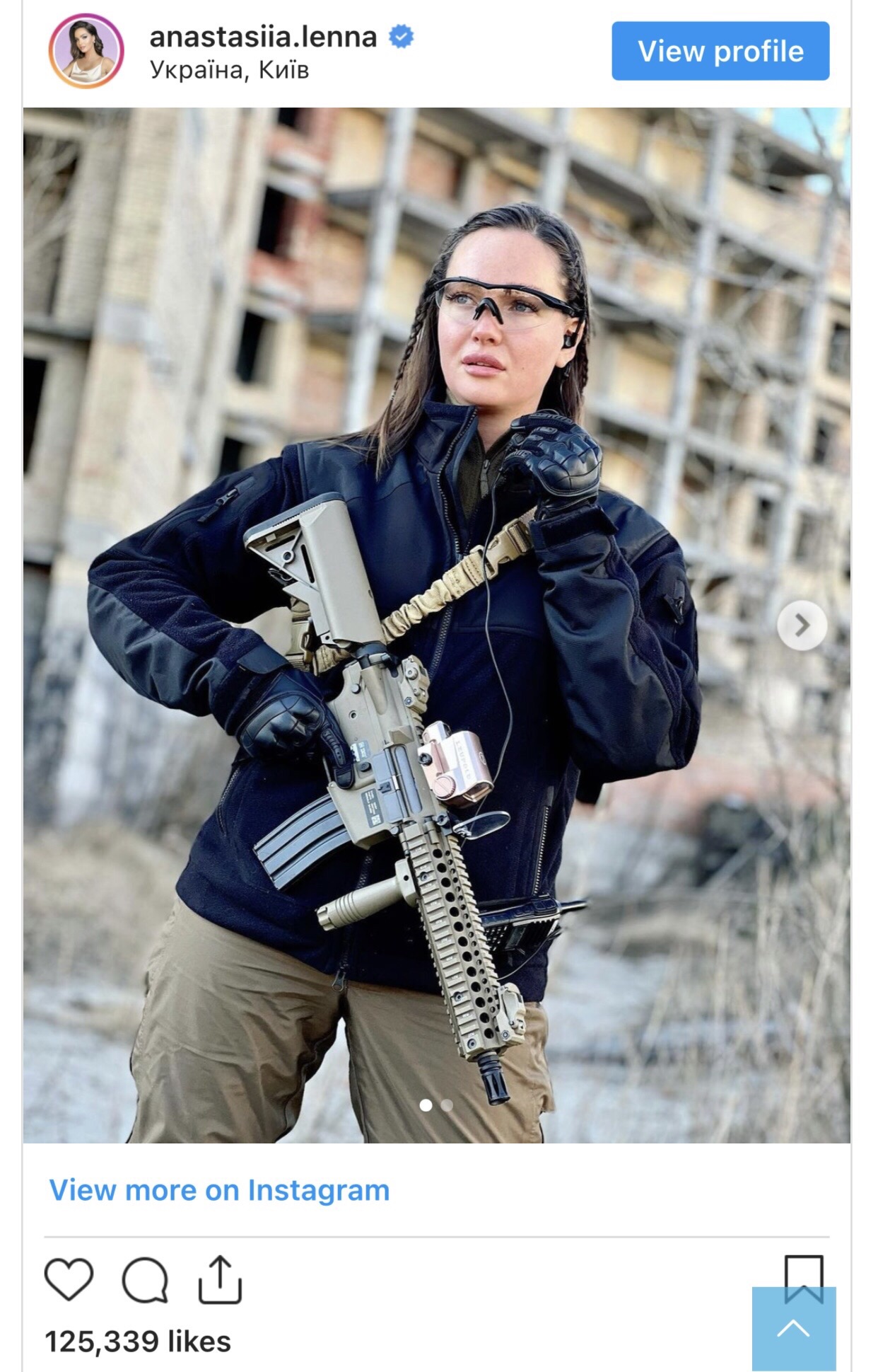 レナさんは銃を手にする自身の姿をインスタグラムに投稿しており、そこには「侵略の意図を持ってウクライナの国境を越える者は殺す」と書かれている。