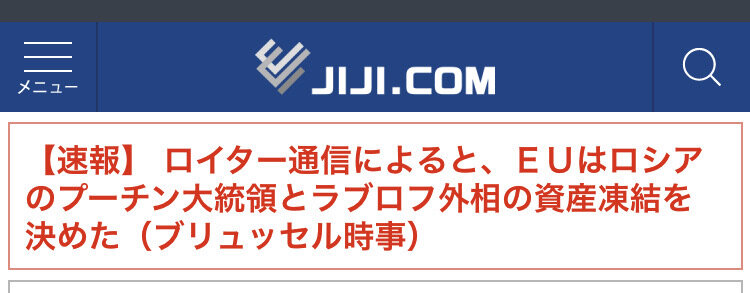 ロイター通信によると、EUはロシアのプーチン大統領とラブロフ外相の資産凍結を決めた(ブリュッセル時事)