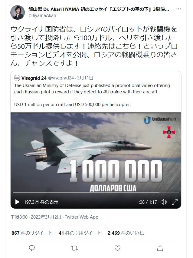 ホーム > ニュースetc > 【朗報】ウクライナ「戦闘機を持参して投降したら100万ドル!」 2022/03/13 1: 以下、?ちゃんねるからVIPがお送りします 2022/03/12(土) 22:05:03.496 ID:zHEqw9A+0.net 大儲けだぜ! 続きを読む Source: 妹はVIPPER - ニュースetc