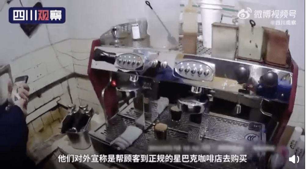 アパート内にあるコーヒーマシンで「偽スタバ」を作る様子(四川観察の動画により)
